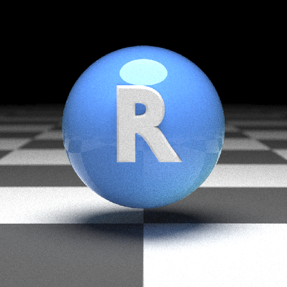 scene = generate_ground(material=diffuse(checkercolor="grey20")) %>% add_object(sphere(y=0.2,material=glossy(color="#2b6eff",reflectance=0.05))) %>% add_object(obj_model(r_obj(),z=1,y=-0.05,scale_obj=0.45,material=diffuse())) %>% add_object(sphere(y=10,z=1,radius=4,material=light(intensity=8))) %>% add_object(sphere(z=15,material=light(intensity=70))) render_scene(scene, parallel = TRUE, width = 800, height = 800, samples = 1000, clamp_value=10)